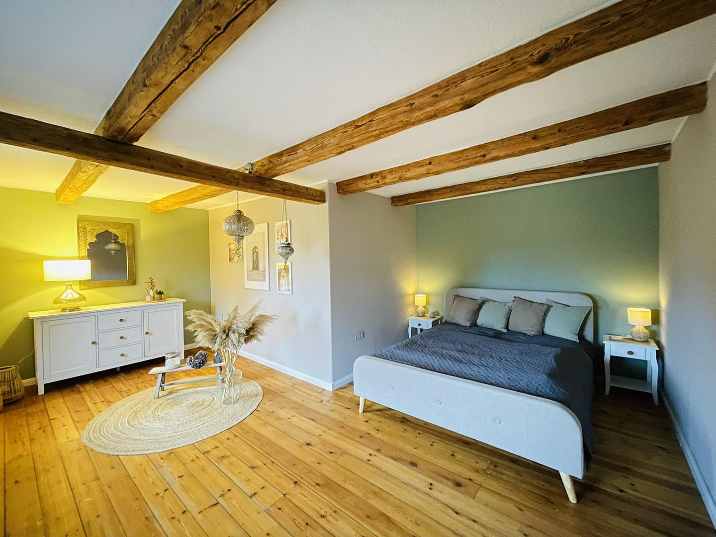 Functional improvements were made in the main building, including a newly built WC in the passageway from the barn to the second stable and a redesigned laundry room with space for two washing machines. In addition, the lighting in barn 2 and workshop 2, including the electrical wiring, was renewed. Further usable space is available in the form of a very spacious hayloft and a pointed loft. In front of the main building is a large garage with space for several vehicles. A gazebo (last used as a chicken coop) and a newly designed terrace area complete the outdoor area.