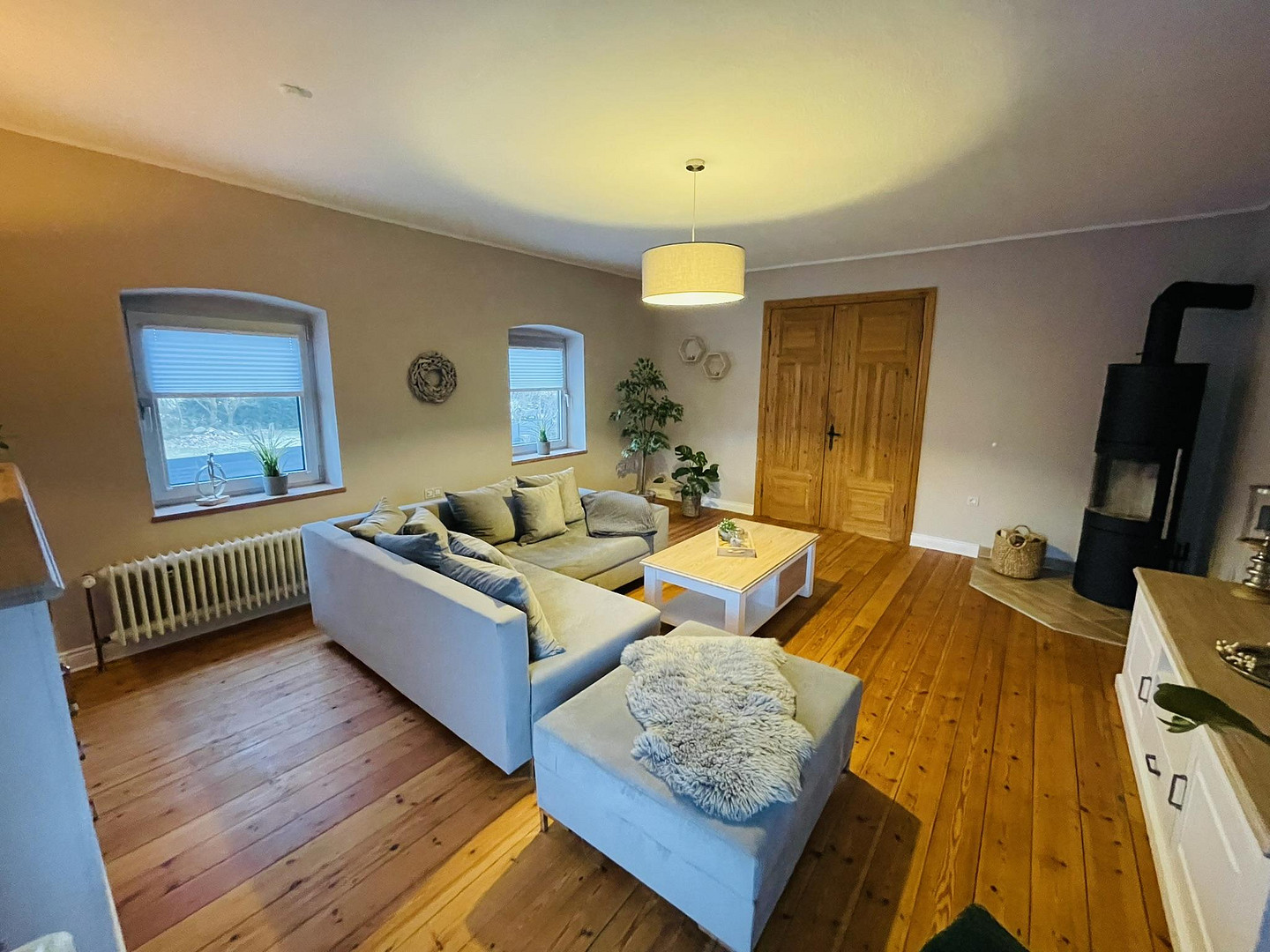 The residential unit on the upper floor has been completely renovated and partially modernized. Bright, spacious rooms create an inviting living ambience. The centerpiece is the living area with a fireplace installed around three years ago. The kitchen with dining area is equipped with an approximately four-year-old fitted kitchen including high-quality appliances (oven, microwave, induction hob, dishwasher, extractor hood and fridge-freezer). Two flexibly usable bedrooms, a fully modernized bathroom and a central hallway round off this residential unit. It can be used without any further renovation work and is suitable both for owner-occupation and for immediate rental.