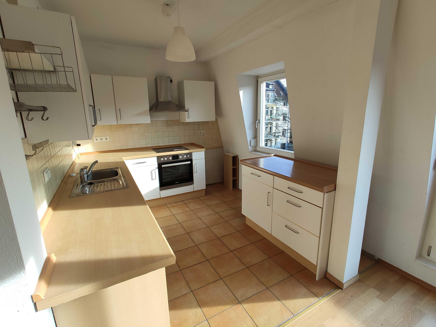 76135 Karlsruhe (Beiertheim-Bulach) – Baden-WürttembergThis spacious apartment is located on the 2nd floor and top floor of a completely renovated and modernized 3-family house. There is only one apartment per floor. Particularly noteworthy is the large open studio on the top floor and the balcony on the south side. The wonderfully unobstructed view overlooks the spacious green inner area with tall old trees. Thanks to the old building, the ceilings are a comfortable height.