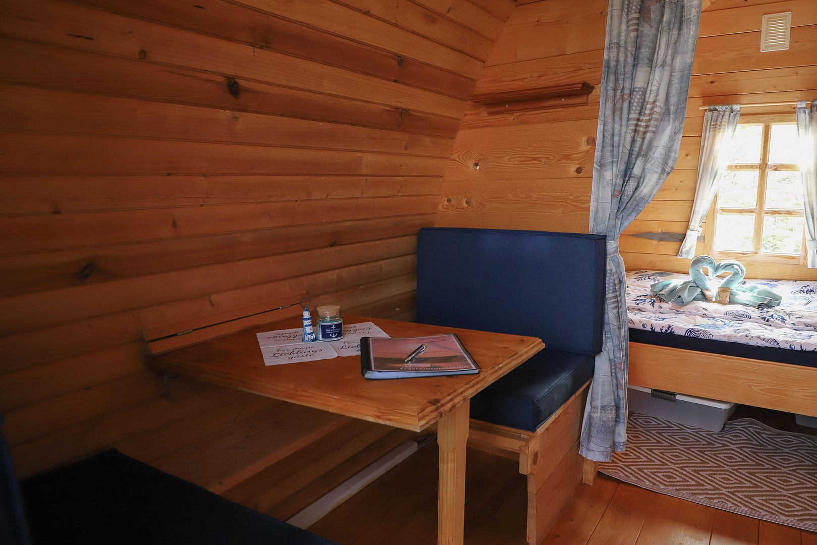 - Interior consisting of a double bed (1.40 m x 2.00 m), a seating area - which can be converted into a 3rd extra bed, a sideboard and small pieces of furniture