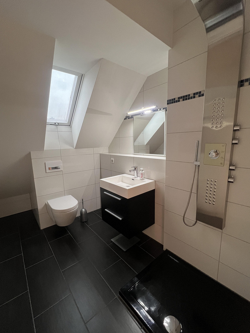 Light as a vital force: Large, floor-to-ceiling, triple-glazed windows flood all floors with natural light. Elegant porcelain tiles run throughout the entire house, creating a stylish and cohesive design that enhances the exclusive atmosphere. Culinary delights & communication: The modern, designer kitchen with its central island is the heart of the open-plan living area – a place that invites cooking and socializing with friends. Your private spa oasis: The stylishly designed main bathroom, featuring a freestanding bathtub, creates a true spa-like atmosphere. A second bathroom and a separate guest toilet complete the comfortable amenities. The studio under the stars: A special highlight is the spacious attic studio in the converted attic – ideal as an inspiring home office, playroom, or private retreat. Garden lounge & potential: Enjoy balmy evenings on the large, covered terrace with views of your approximately 93 m² green garden, which offers plenty of privacy. Another advantage: The fully developed basement (currently used as a beauty salon) offers flexible space for business or hobbies.