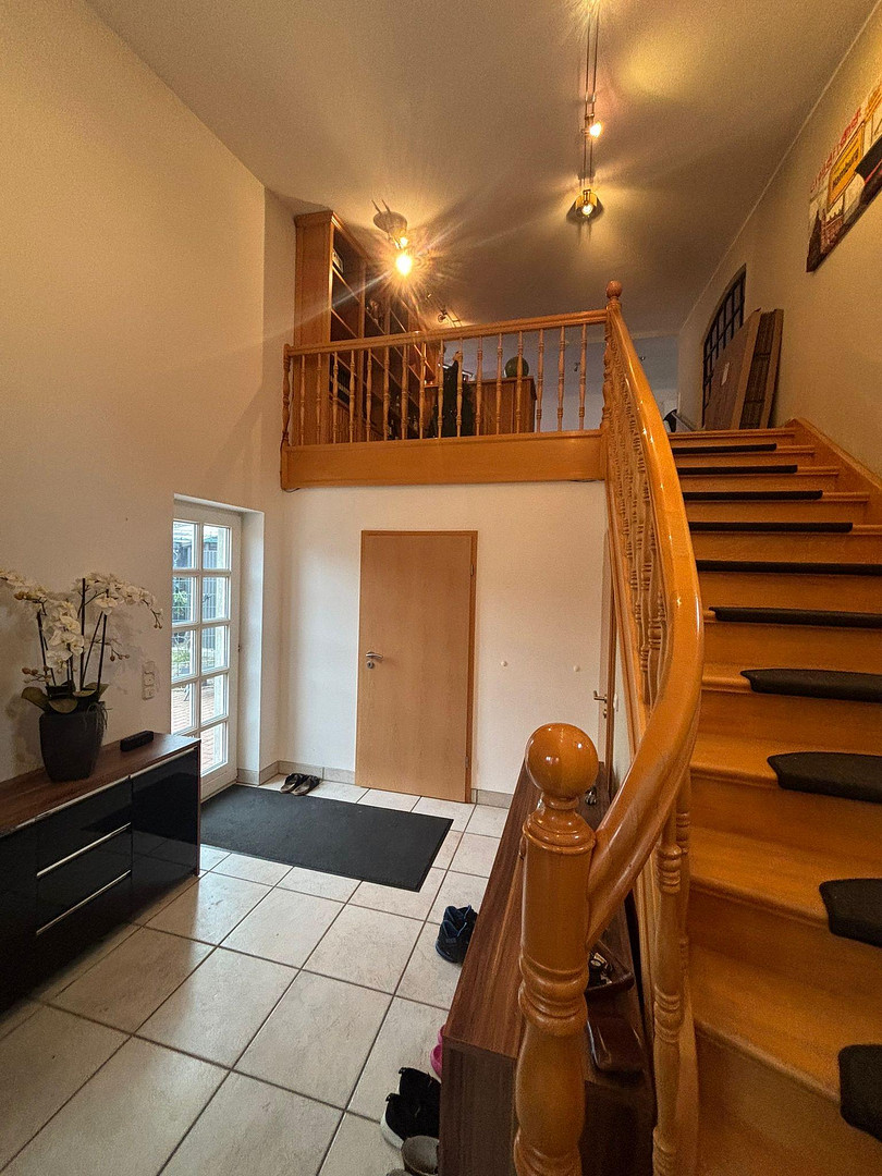 A guest room with its own WC and shower awaits you on the first floor. A wooden staircase leads to the first floor, where an open gallery and a spacious living room with fireplace await you. The bright conservatory offers beautiful access to the balcony, where you can enjoy the first rays of sunshine. All floor-to-ceiling windows are fitted with pleated blinds. The spacious kitchen is equipped with a counter, a dishwasher, a larder unit and a fridge-freezer.