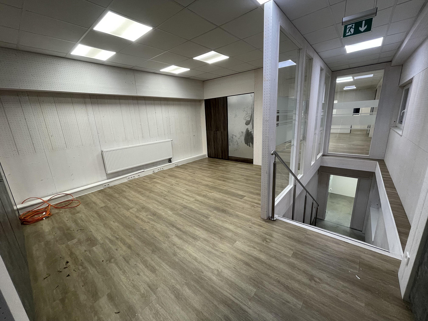 The modern office space is located on the upper floor and is complemented by a server and technical room, gender-segregated toilets and a kitchen with lounge.
