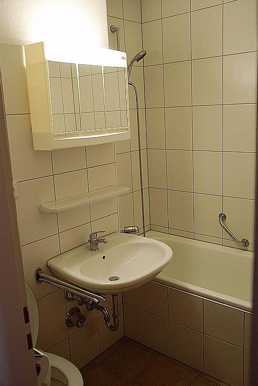The tiled bathroom consists of a combination bathtub with shower. The bathroom contains a washbasin with hot and cold water connections including calibrated water meters. An existing mirror cabinet above the washbasin is used in the bathroom. The WC is also in this room.