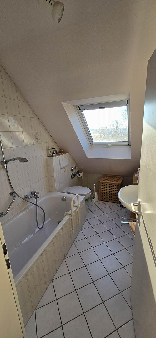 A fitted kitchen with all appliances is available. The bathroom with daylight window is equipped with a bathtub and shower wall, parking space for washing machine and possibly dryer available.