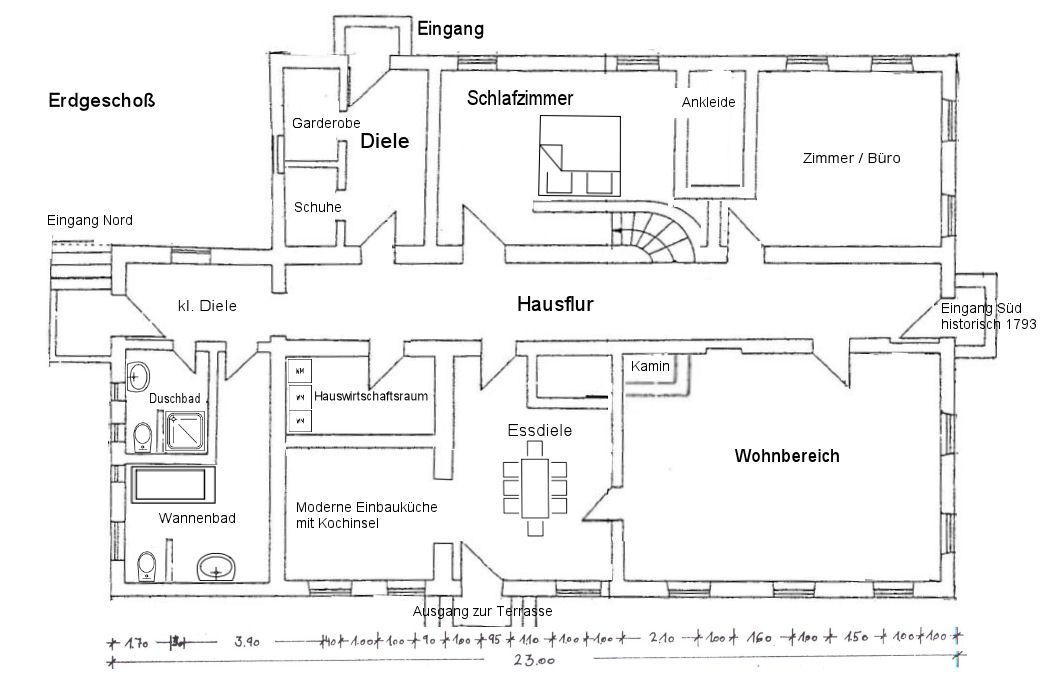 The main building alone measures approx. 23 m x 13.5 m. The historically restored entrance door has been preserved, but is not used as an entrance. Behind it is the long corridor with access to the rooms and bathrooms. The historic doors have been tastefully restored, as has the internal wooden staircase to the upper floor. The former parlor has been transformed into a living area with a brick fireplace, while the tavern, kitchen and storage rooms have been converted into a dining area, utility room and a modern open-plan fitted kitchen with cooking island and all electrical appliances. The former guest toilets have been converted into spacious, attractive bathrooms. The covered main entrance is now on the east side with hallway and checkroom.