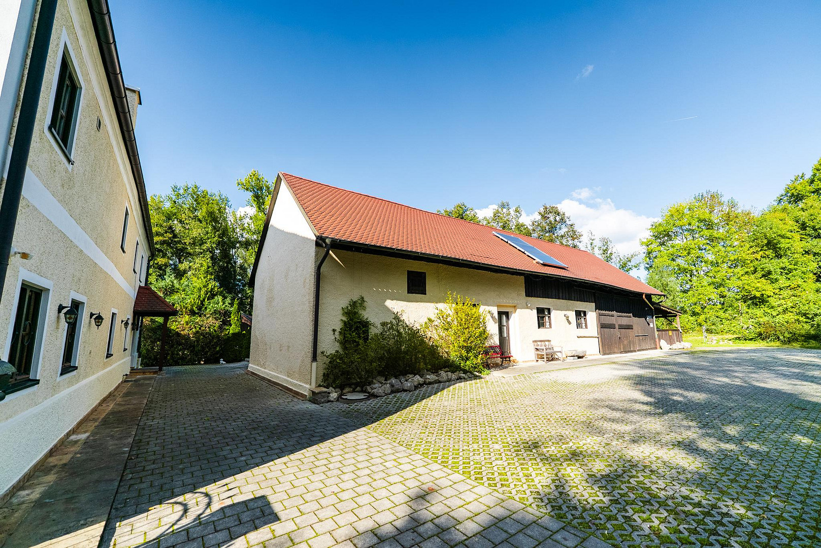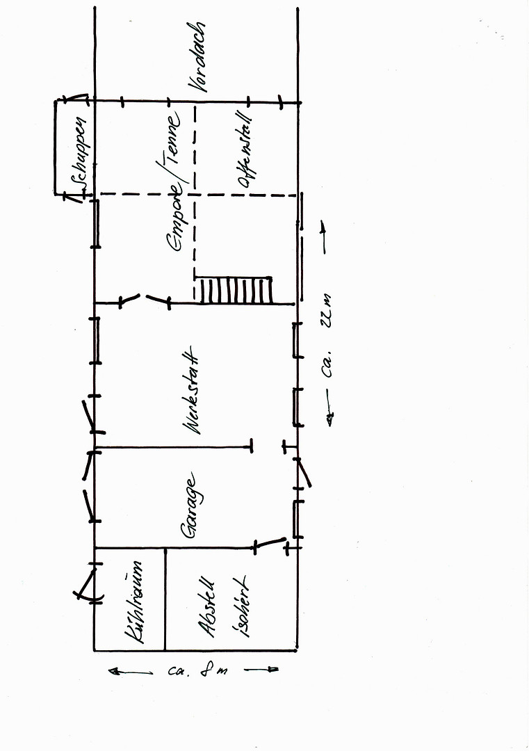 The large outbuilding, the coach house, offers a variety of large usable and storage areas, garages, workshop and the former horse stable, with a continuous threshing floor in the gable. An ideal constellation for e.g. craft businesses with a need for large indoor storage areas and/or for (large) animal husbandry.