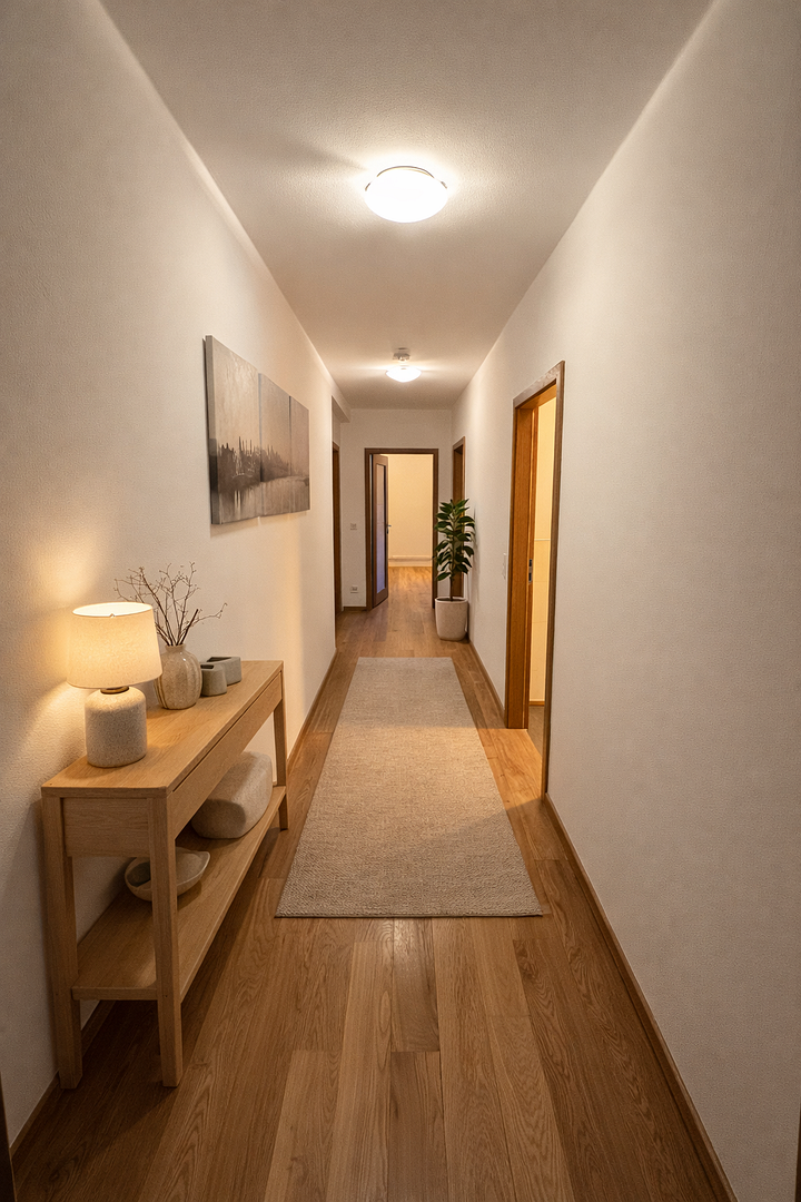 - Floors: oiled oak real wood parquet (solid wood) and tiles
