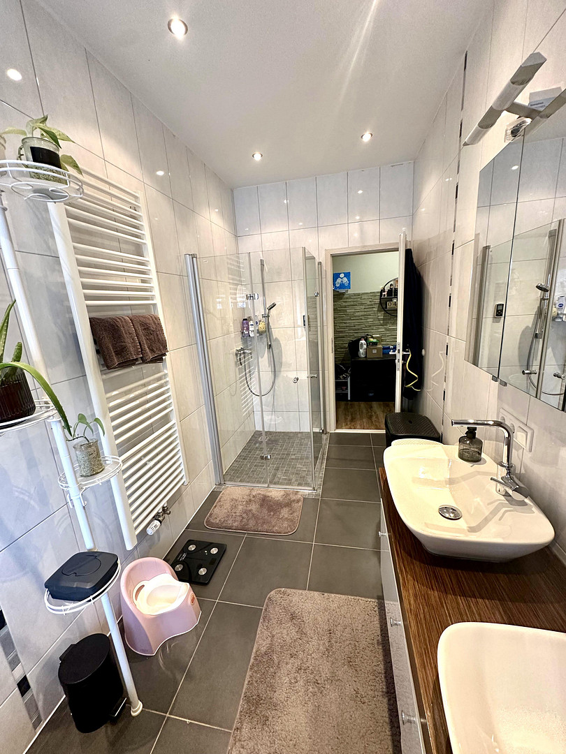 The technical equipment leaves nothing to be desired: A smart home system (Homematic) enables convenient control of radiators and shutters. Network cabling is available in the children's room, bedroom, dining room and living room and offers a stable, wired internet connection - ideal for working from home or streaming. Underfloor heating is installed in the bathroom and kitchen to keep your feet warm. An ABUS armored bolt on the apartment door provides an additional sense of security. Even if it has never had to prove its worth ;-)