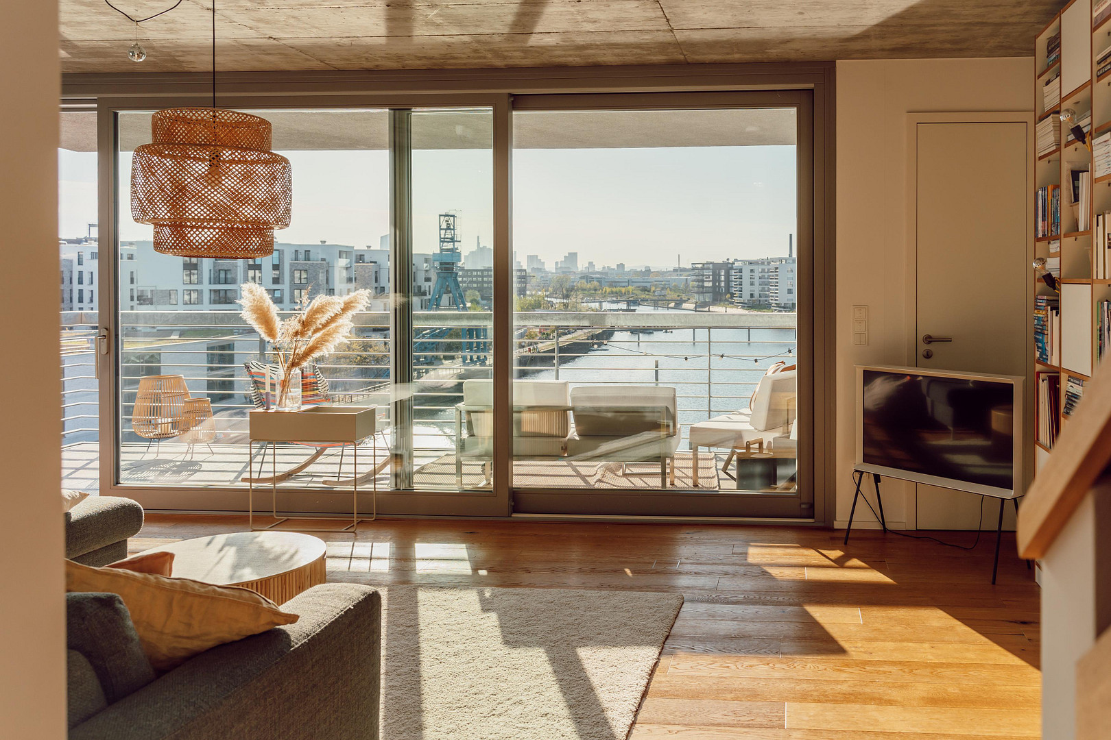 The highlight? The breathtaking view of the water and the Frankfurt skyline - whether you're enjoying your first coffee on the balcony or watching the sun set over the city skyline. Exposed concrete ceilings on two levels set urban accents, while the underfloor heating ensures cozy warmth and living comfort.