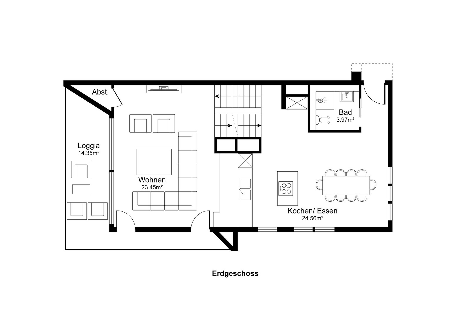 The open kitchen with cooking island is equipped with modern brand appliances (Bosch, AEG) and blends seamlessly into the bright dining area with windows facing east and south - ideal for communicative cooking. Generous built-in cupboards provide plenty of storage space without interrupting the clean look of the rooms.