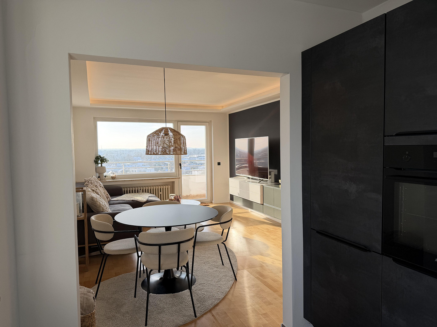 The apartment is located on the 8th floor of an apartment building and can be reached both via the staircase and an elevator. It offers an unobstructed south-west view. The living space is approx. 66 m² including a proportionate balcony, plus a separate cellar compartment. The apartment was extensively modernized in 2023. This included the renewal of the electrics, the complete modernization of the bathroom and the installation of a new fitted kitchen. An opening was created between the living room and kitchen to create an open, bright and modern floor plan. All the walls and ceilings were stripped of wood paneling and plaster and finished with fine plaster. A well thought-out lighting concept was also implemented. A washing machine connection was installed in the storage room. The living room and bedroom have large south-west-facing windows and doors with direct access to the balcony. As a result, both rooms are particularly bright and flooded with light. The living room is also equipped with a suspended ceiling with indirect ceiling lighting, which creates a modern and pleasant living atmosphere. The fitted kitchen was newly installed in 2023 and is functionally and visually coordinated with the open-plan living and dining area. The large window fronts provide plenty of natural light at all times. The bathroom is modern and has a shower with overhead and hand shower, a washbasin, a WC and a designer bathroom radiator. The bathroom, bedroom, living room and storage room are accessible via a spacious hallway, which offers enough space for a wardrobe, shoe cupboard or a dressing solution. As an alternative to the washing machine connection in the utility room, washing facilities are also available in the cellar. The living room, bedroom and hallway feature restored real wood parquet flooring. The kitchen, bathroom and storage room are tiled. Overall, the apartment impresses with a well thought-out room layout, bright living spaces and a modern, timeless furnishing standard.