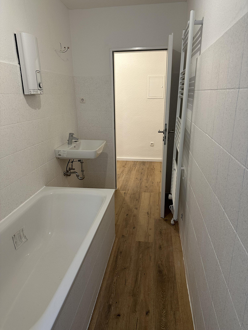 The daylight bathroom has a window and is equipped with a new washbasin, new bathtub and a new suspended WC.
