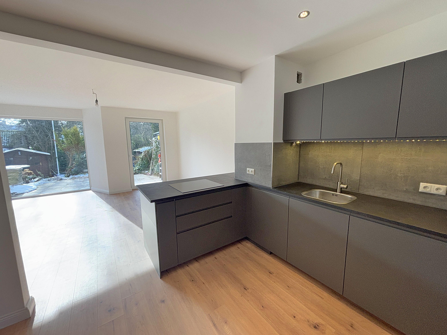 22143 Hamburg (Rahlstedt)An extensively modernized terraced house with an open floor plan, heat pump and energy class B is for sale. The house has 5 rooms and a living space of approx. 92 m². The recently completed work included: a new roof with insulation, replacement of the windows, the redesign of all rooms with tiles in large format 60x60cm, modernization of the electrics, fine plastered and sanded walls, two redesigned bathrooms, insulation of the roof, installation of a central air/air heat pump and a new open fitted kitchen. This is equipped with a dishwasher, hob, fridge/freezer combination, modern oven and much more. The hallway, kitchen and bathrooms are fitted with LED ceiling spotlights. The terrace faces south/west and invites you to spend relaxing hours outdoors. The garden offers space for individual design options.