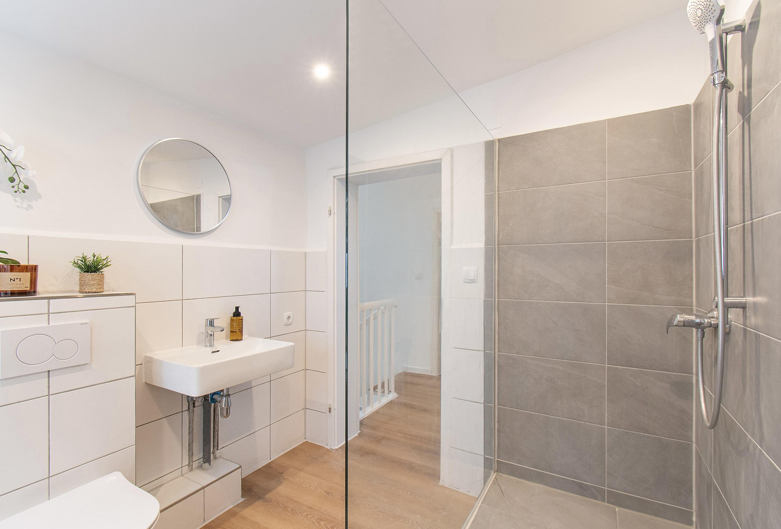 The house impresses with a spacious and bright living and dining area, an open kitchen area as the center of the house, as well as an ideal room layout with 4 bedrooms of approximately the same size. In the living area, a large, floor-to-ceiling window front creates a bright, friendly atmosphere and opens up a view of the garden to the south and a large south-west-facing terrace. The wood-burning stove ensures cozy living comfort on cold days.