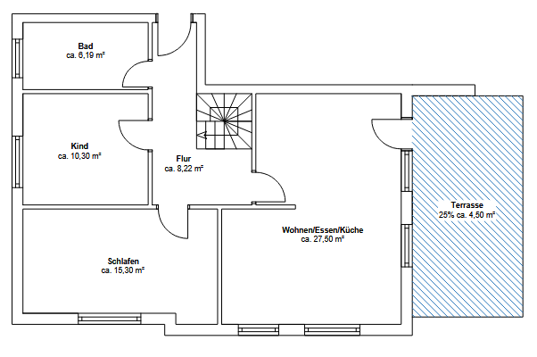 The living space is approximately 82 m², with 50% of the basement hobby room and 25% of the terrace being included in the calculation (according to the German living space calculation regulations). However, the total usable space is approximately 109 m².