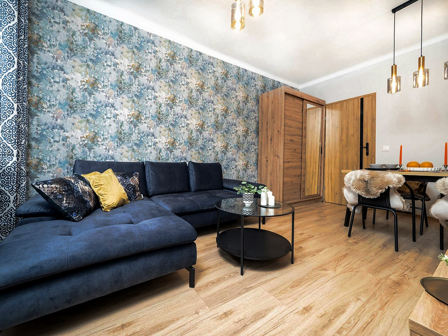 Parquet flooring throughout the apartment (tiles in the bathroom)