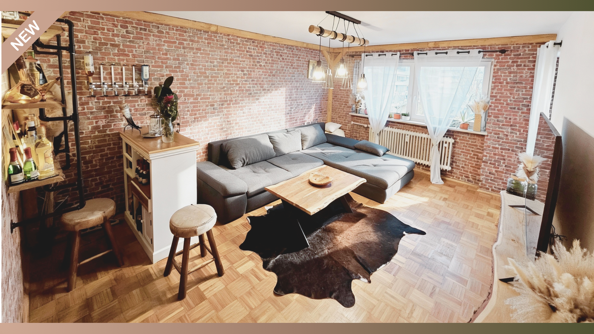Loft living room with rustic brick wall, designer kitchen from 2022 and a completely renovated bathroom immediately make a statement. A south-facing balcony overlooking greenery plus energy class B provide substance, not just looks.
