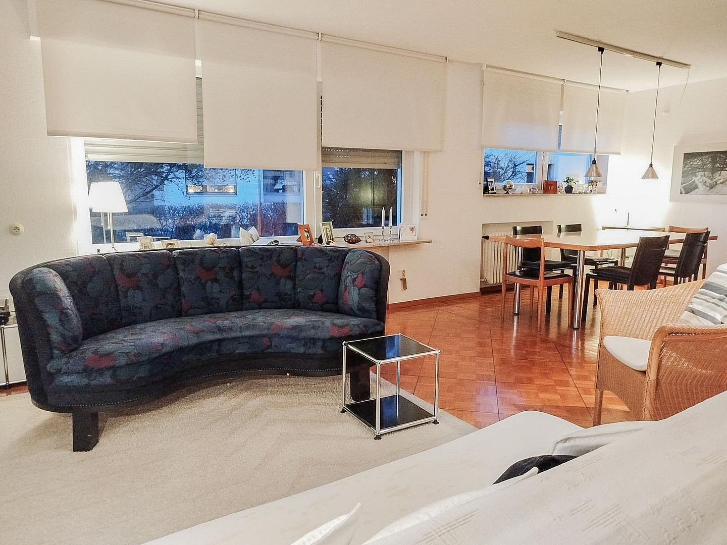 Built in 1965 in solid construction, the house impresses with its solid substance. It has a full basement and two separate residential units, including an attractive two-bedroom granny apartment on the first floor with its own terrace and view of the spacious garden.