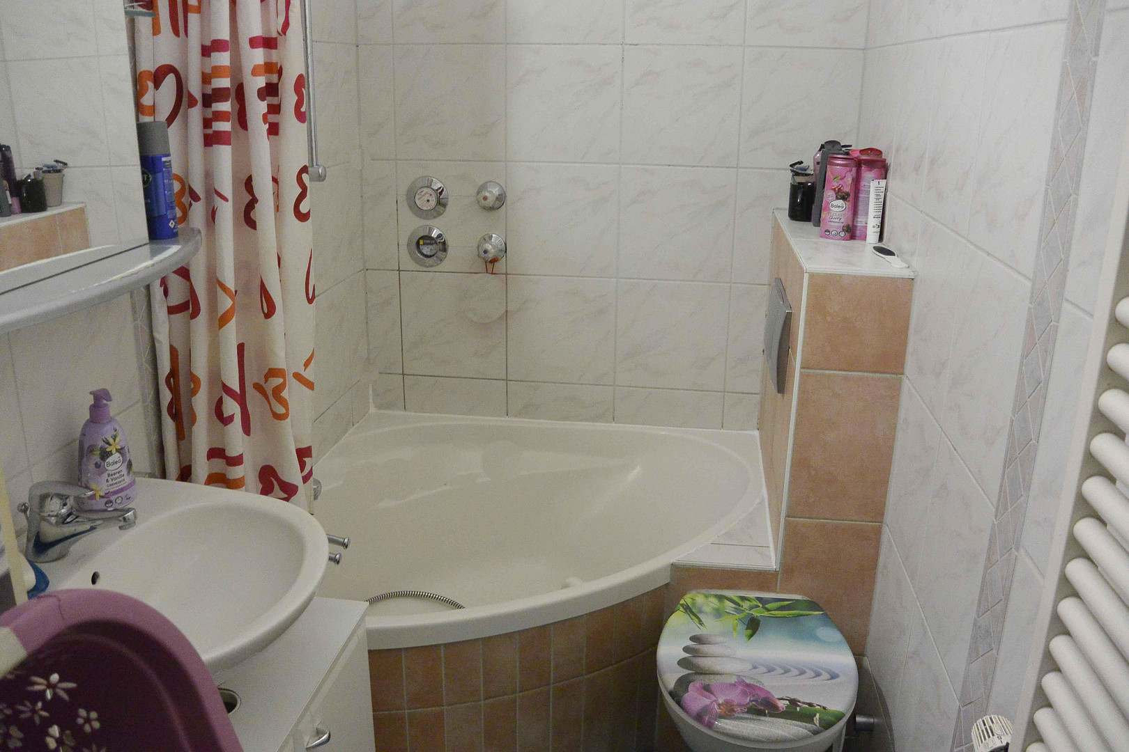 The floors of the rooms and the hallway are laid with beech wood laminate. Beautifully tiled bathroom with corner bathtub.