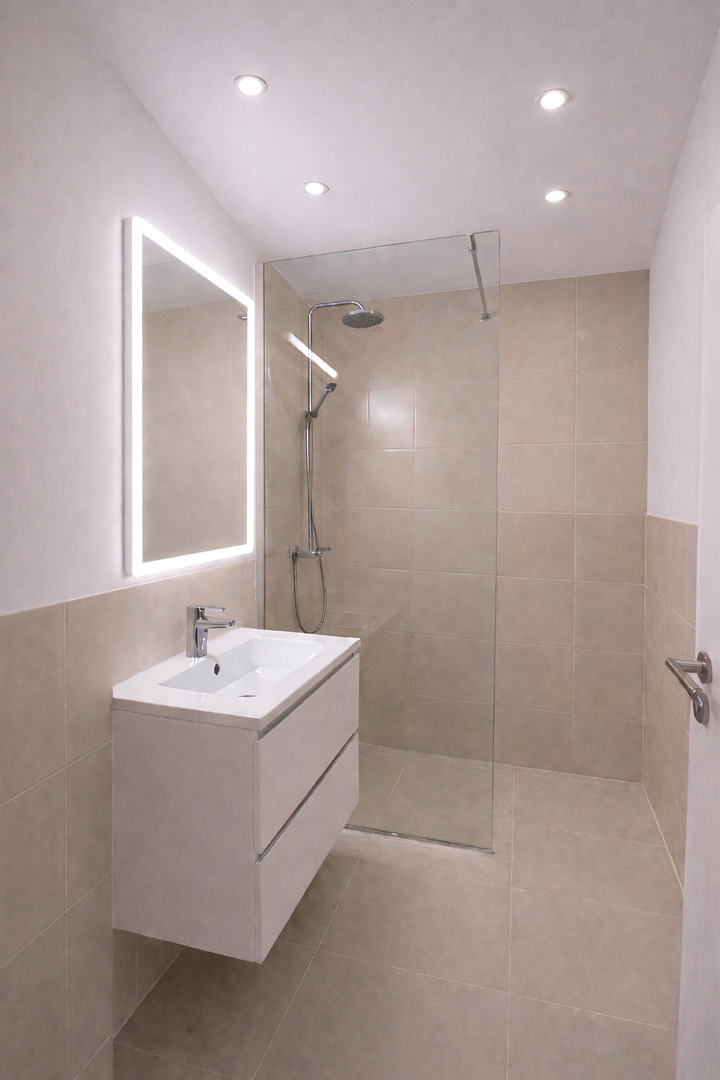 - High-quality sanitary fixtures and timeless porcelain tiles (60x60 cm).