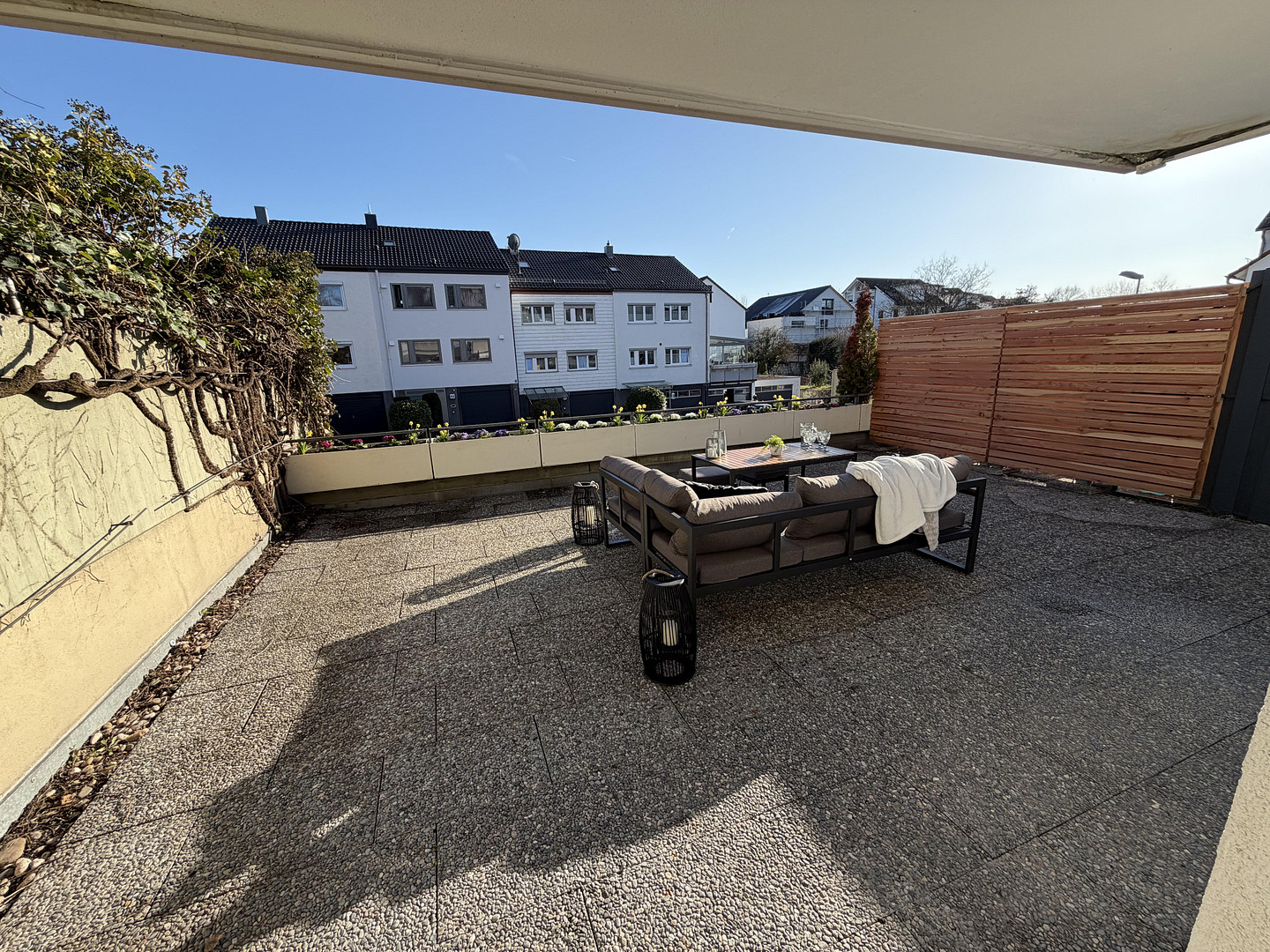 Welcome to your potential new home! As you enter the apartment, you'll be greeted by the warm oak parquet flooring, which flows harmoniously throughout all the rooms. The freshly painted walls, recessed lighting in every room, and the many windows create a pleasant living atmosphere. The new electrical outlets, light switches, white walls, and doors further enhance this modern home. The spacious living room invites you to relax and offers plenty of space for cozy evenings with friends and family. The large terrace in front of the living room is perfect for enjoying breakfast outdoors or unwinding with a glass of wine in the evening. The comfortable atmosphere extends to the bedrooms, which offer ample space for restful nights. The bathroom with its large shower and the separate toilet complete the living space. Of particular note is the large hobby room in the basement, which offers a variety of uses. Whether as a home office, study, or for pursuing freelance work, you'll find your ideal space for creative endeavors here. The basement features a laundry room where you can place your washing machine, freeing up space in the apartment. A private garage, plus an additional parking space in front, and a private storage room complete the amenities of this property. In short, this apartment with its large terrace and versatile layout is just a few minutes' walk from shops, schools, and public transportation, leaving nothing to be desired. Come and see for yourself this unique living space! Please note: The furniture (including the fitted kitchen) and decorative items shown in the property photos are for illustrative purposes only and are not included in the sale.