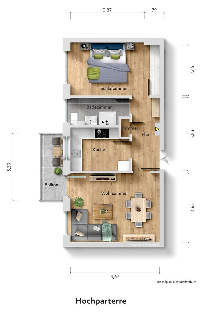 A particular highlight is the wonderful sun balcony, which allows for relaxing hours with a view of the greenery. The orientation provides plenty of natural light and creates a bright and welcoming atmosphere in the rooms.