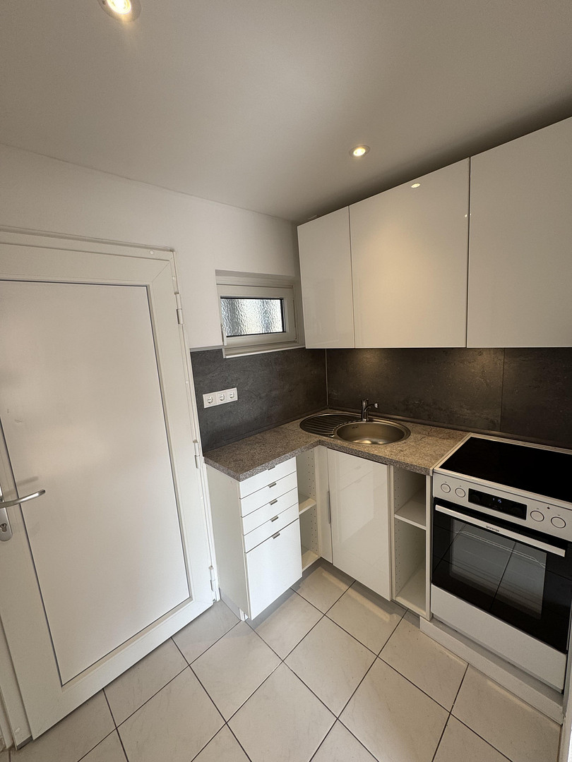 - Small fitted kitchen with cabinets, sink, refrigerator, and new stove