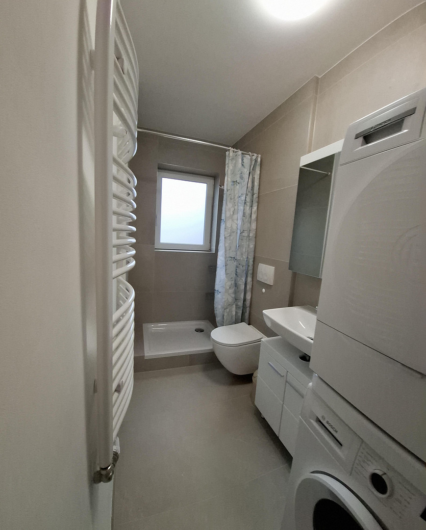 The apartment is being sold with its existing fixtures and fittings. These include: a new, high-quality built-in kitchen, a 2-meter Bosch refrigerator, a Bosch washing machine, a Bosch tumble dryer, lighting fixtures in all rooms, and a wardrobe.
