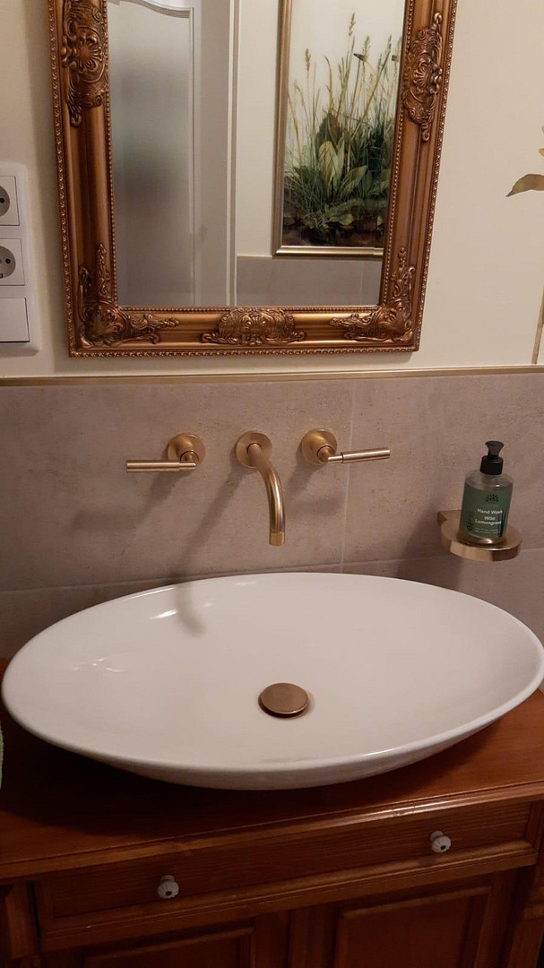 In the bathroom on the upper floor, there is also a freestanding bathtub (Villeroy & Boch) and a built-in seating area in the shower.