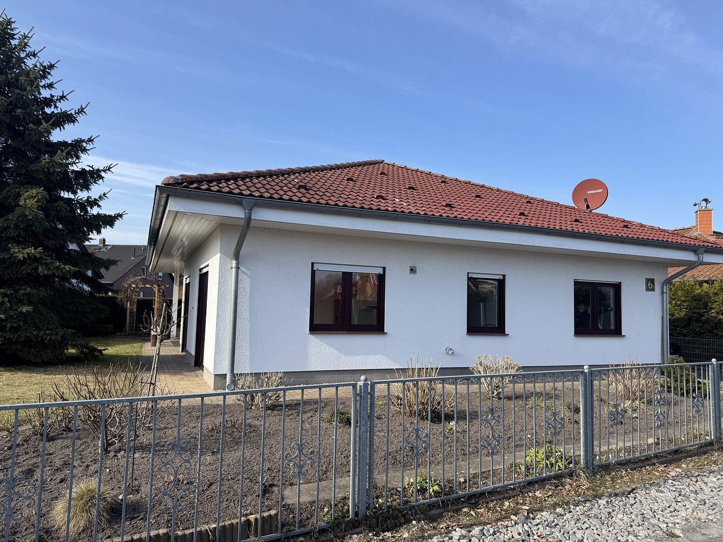 17454 ZInnowitz (Zinnowitz) – Mecklenburg-VorpommernThis cozy single-family home, built in the bungalow style, offers approximately 110 square meters of living space and is situated on a 565 square meter corner lot in a quiet residential area of Zinnowitz, not far from the Baltic Sea beach. Built in 2005 using solid construction methods and featuring high-quality finishes, the house comprises 3 rooms, 1 bathroom, and an additional guest toilet, all on a single, accessible level. The bathroom features white wall tiles and terracotta floor tiles. It includes both a shower and a corner bathtub. Floor-to-ceiling windows in the kitchen and living room allow plenty of sunlight to flood the rooms. Adjacent to the kitchen is a practical utility room with connections for household appliances, as well as space for a washing machine and dryer. The utility room also has a large window. The sheltered terrace on the southwest side offers views of the beautiful, fully fenced garden. In the garden, there is also a fully functional wooden summer house, which provides additional accommodation options. In addition, there is an oversized garage on the property, which, in addition to providing space for vehicles, also serves as a workshop for DIY enthusiasts. ;-)