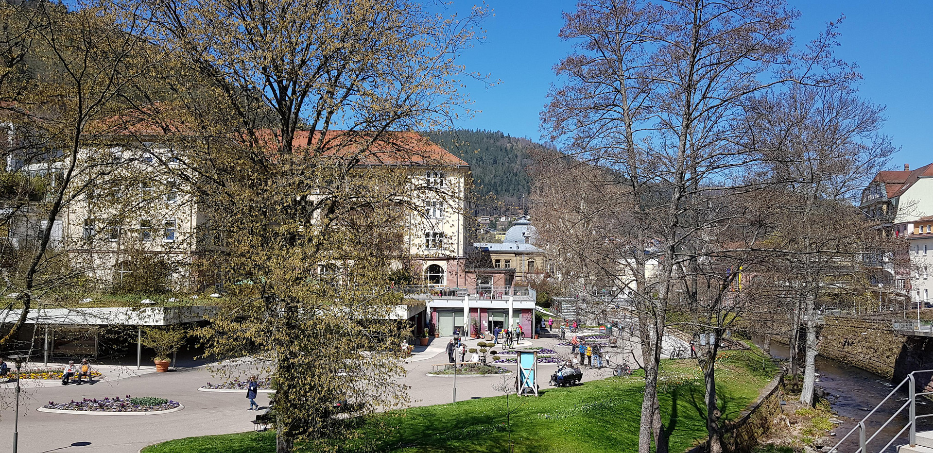Located on Kurplatz in Bad Wildbad, near Palais Thermal. It's situated in a pedestrian zone, with the Enz river flowing at the back, and the S-Bahn station is just a few meters away, as is the Kurpark. Parking is available in nearby parking garages. The location benefits from excellent infrastructure, with shops for daily necessities, as well as doctors and pharmacies. Numerous leisure activities, such as hiking trails, a summer toboggan run, and the famous treetop walkway, are within easy reach. Public transportation is readily available via train stations and bus lines, allowing for quick access to surrounding towns and regions.