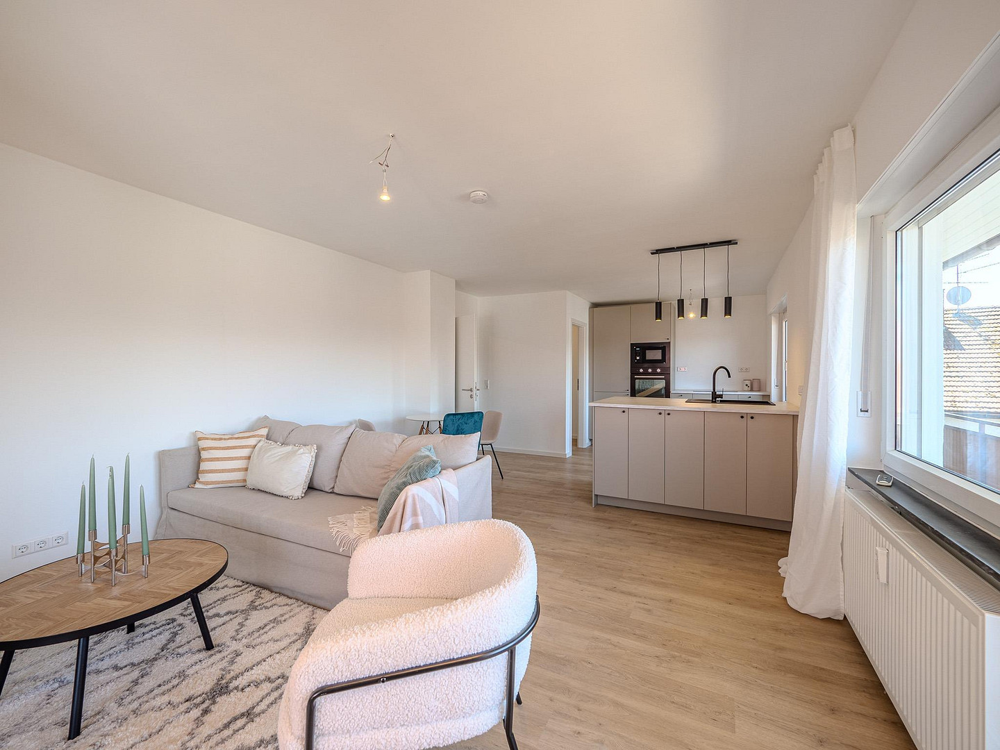 This spacious 3-room apartment offers approximately 80 square meters of living space and impresses with its well-thought-out layout and modern, high-quality finishes. The heart of the apartment is the bright living and dining area with an open-plan kitchen and direct access to the large, fully covered east-facing balcony. Here, you can enjoy the morning sun while having a relaxing breakfast – fresh bread is conveniently available from the bakery just two houses away. The high-quality, new fitted kitchen leaves nothing to be desired and features: