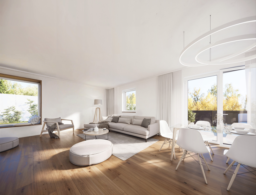 Here, you will find a generous, light-filled living and dining area with an integrated, open-plan kitchen. The open layout creates a modern living environment with plenty of space for individual design. From here, you have direct access to the terrace and garden – perfect for relaxing hours outdoors. An additional study on this floor provides ideal conditions for working from home, or it can alternatively be used as a guest room or hobby room.