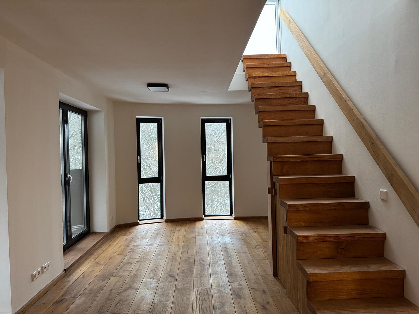 The apartment is finished with natural clay paints, promoting a healthy living environment. High-quality solid oak parquet flooring in the living areas, and dark grey tiles in the kitchen and bathroom, create a unique and sophisticated atmosphere.