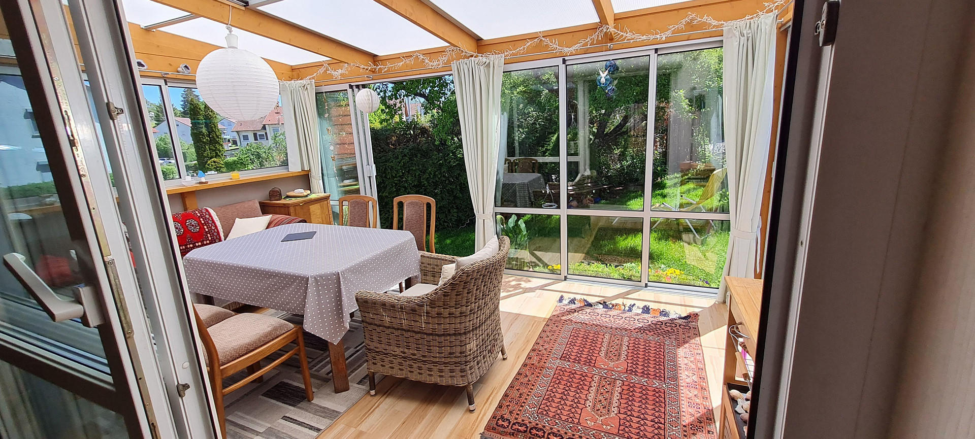 There is a small garden adjacent to the sunroom and surrounding the house.
