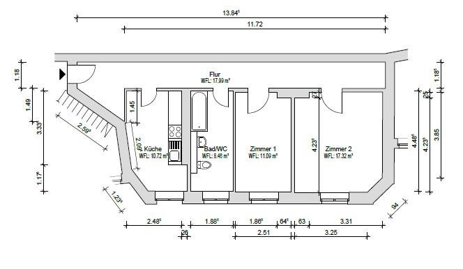 Both rooms have separate entrances and large windows. The kitchen has a window, and there is a tiled bathroom with a bathtub, also with a window, as well as a connection for a washing machine.