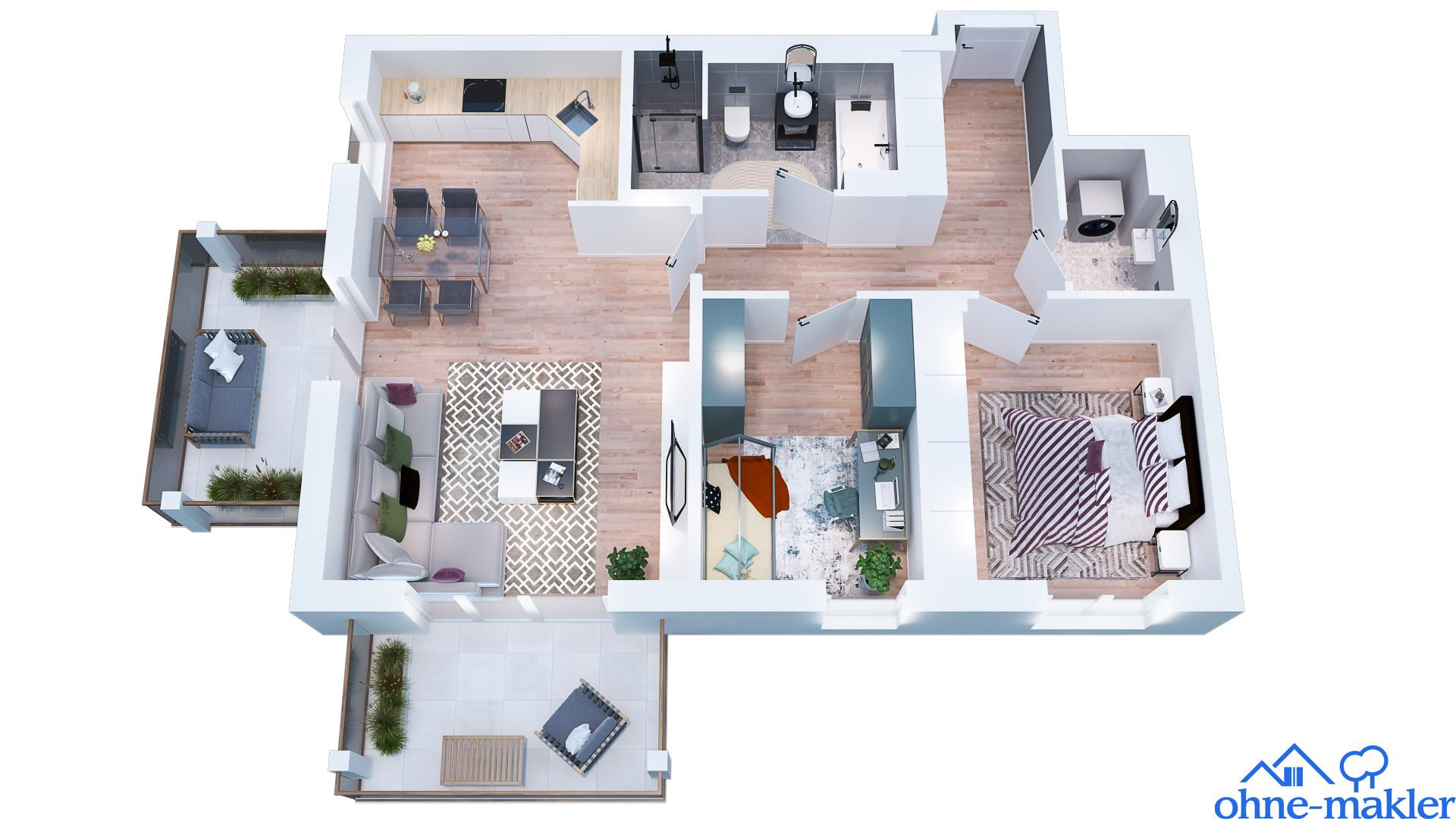Theresienbogen 23, 85716 Unterschleißheim – BayernModern and high-quality finishes, direct access to the underground garage, storage room in the basement, bicycle storage, underfloor heating, active room ventilation system, bathroom with bathtub and walk-in shower, stroller parking area, space for a clothes dryer, refuse room, two spacious covered balconies, 3rd floor, electric blinds, triple-glazed windows, floor-to-ceiling windows, no commission fees.