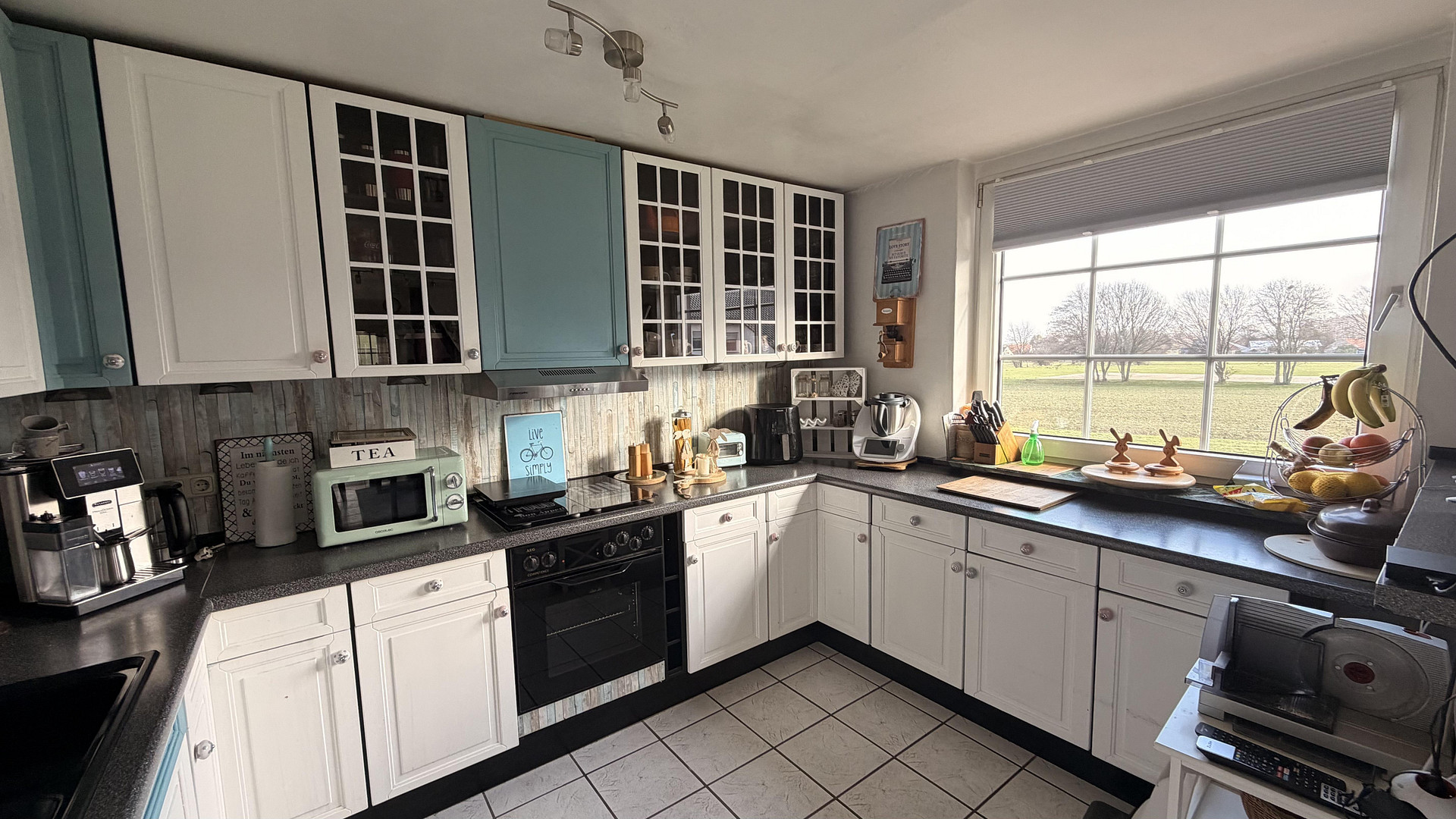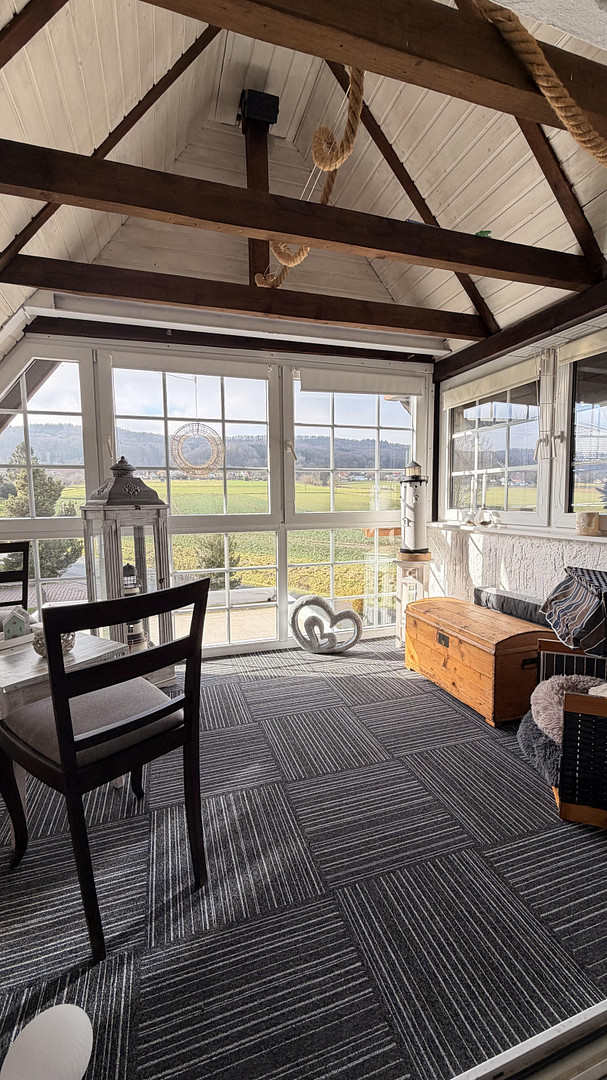 The lovingly landscaped garden offers an unobstructed view over the fields. From here, you have an impressive view of the Wiehengebirge mountain range, which is just a few minutes away, perfect for beautiful walks in the woods.