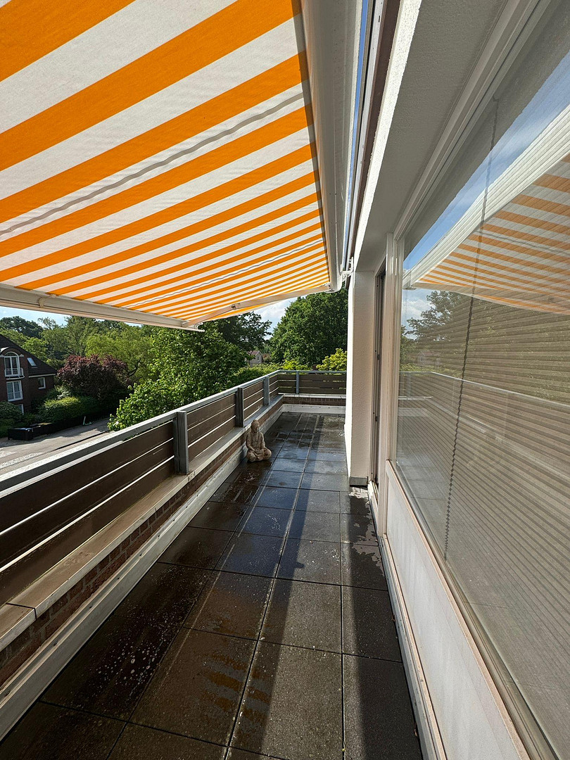 Hummelsbütteler Hauptstraße 31, 22399 Hamburg (Hummelsbüttel)This charming, well-rented 1-room penthouse apartment, with approximately 43 square meters of living space (including a share of the terrace), is located on the 2nd floor/split-level floor of a well-maintained building from 1974 in Hamburg-Hummelsbüttel. The apartment was extensively renovated in 2018 and features a well-designed layout, an open-plan kitchen, and a wrap-around terrace facing south-east. The bathroom is modern and high-quality, and central heating provides comfortable warmth. The apartment is ideal for singles who appreciate a well-connected location or are looking for a second home. As an investment property with reliable tenants and potential for rent increases, the apartment is definitely a very good option. A spacious basement storage room and a parking space in the building are included with the apartment. This is also rented out and is offered for EUR 32,000. The size of the apartment, including the share of the terrace, is 43.2 square meters. The terrace has an area of 20.4 square meters, of which 5.1 square meters are included in the living space. The heated area of the apartment is 38.1 square meters. The built-in kitchen with branded NEFF appliances (refrigerator, oven, dishwasher, hob) was installed in 2018. Many details were custom-made by a carpenter, such as the solid oak shelves in the bathroom and kitchen, or the built-in closet in the hallway. The electric awning with a switch in the living room, concealed within the wall, is from MarkiLux.