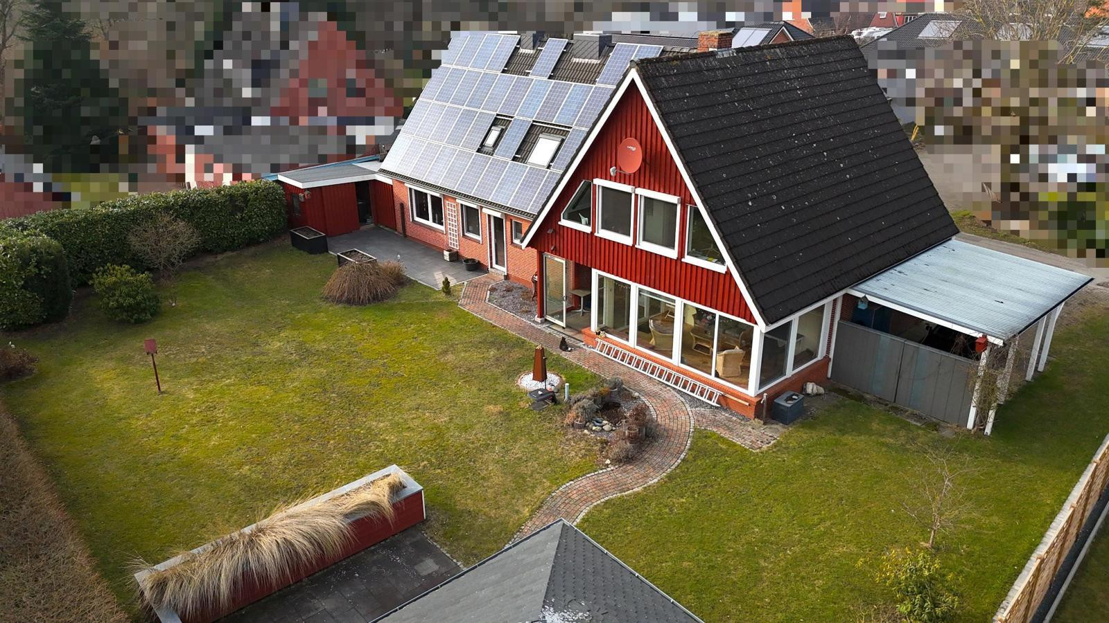25842 Langenhorn (Loheide) – Schleswig-HolsteinLocated in a pleasant and quiet residential area of Langenhorn (Mönkebüll), this well-maintained detached house is situated on a generous 962 m² plot. The main house, built in 1964, was extended in 1988, combining solid construction with a well-thought-out layout and continuous modernization. With approximately 166 m² of living space, the property offers ample room for comfortable and harmonious family living. From the moment you enter the house, you feel a warm and inviting atmosphere. The bright living room, with its integrated dining area, forms the heart of the house. The newly installed fireplace, dating from 2025, creates a cozy atmosphere during the colder months and adds a special quality to the room. Large windows create a friendly ambiance and connect the interior and exterior spaces in a pleasant way. The kitchen is functionally equipped and features appliances in excellent working order. The property also includes three bedrooms, a study, a bathroom with a shower and bathtub, a guest toilet, a small laundry room, and a utility room. The basement offers additional living space and storage. A special highlight is the approximately 19 m² sunroom, which extends the living area and provides a sheltered view of the garden. Here, you can enjoy a bright and relaxing atmosphere in all seasons. The south-facing garden offers plenty of sunshine and space for relaxation. Two generous terraces invite you to linger; one of them is partially equipped with a stylish wooden gazebo, creating a sheltered spot for long summer evenings. A new wooden fence installed in 2025 provides increased privacy. In addition, there is a practical shed for garden tools, as well as storage space for firewood. A large garage and a carport comfortably complete the outdoor amenities.