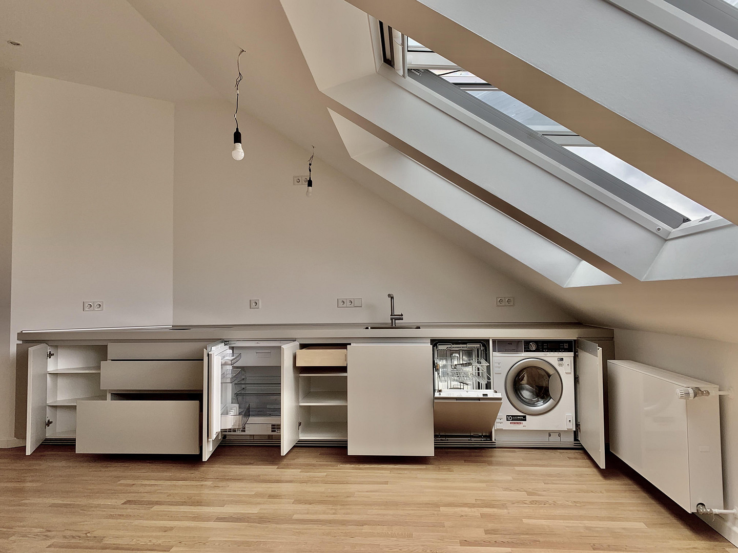 Bright apartment with a fantastic view over Düsseldorf. High-quality furnishings. Large living/dining area with a built-in Bulthaup kitchenette. Large bedroom with a walk-in closet and space for an additional desk as a workspace.