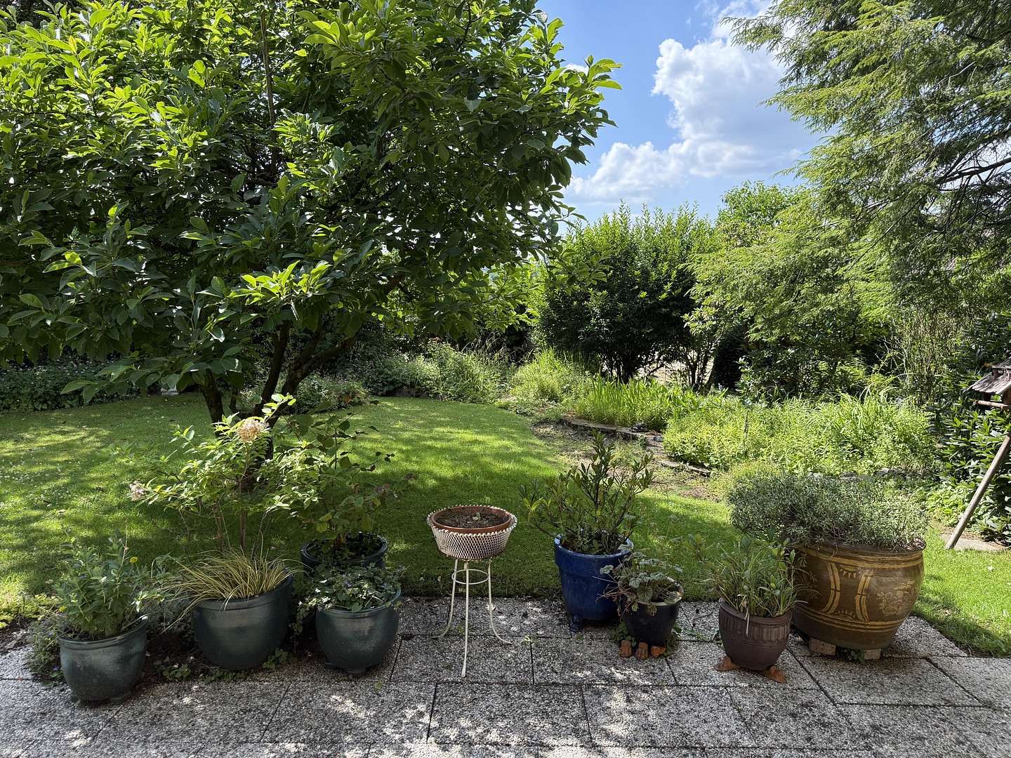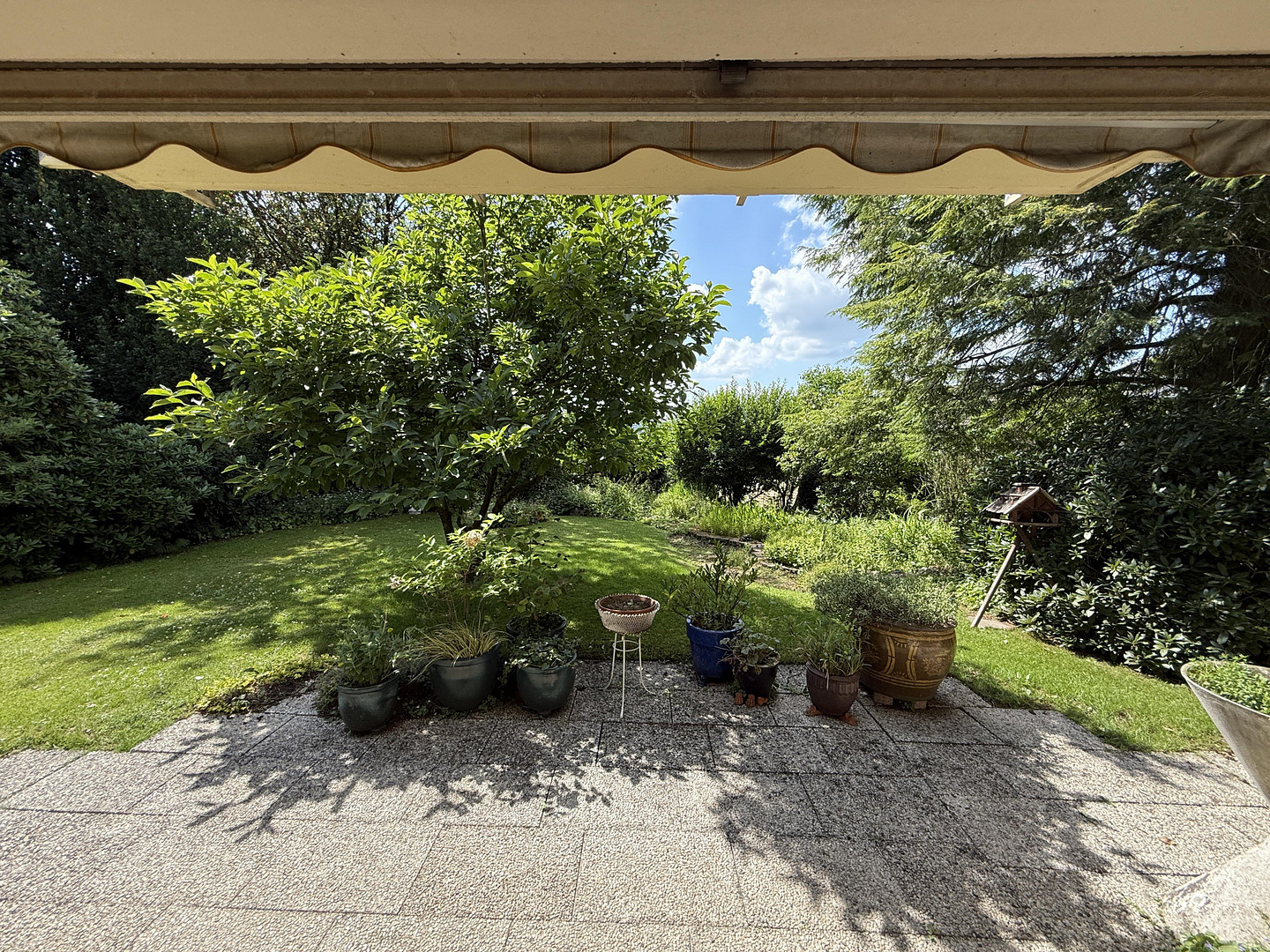 Bedroom with a large balcony, two children's rooms, bathroom (partially modernized). All rooms have large windows and are therefore very bright. An extension built in 1977/78, which can be expanded, contains a roughly 37 square meter hobby room or party room, as well as a small guest toilet with direct access to the garden. The house is partially basement, and there is no dampness. Two garages plus a storage room, as well as 2-3 parking spaces in the spacious driveway. Oil-fired heating system from 2002. The large garden, which is planted with beautiful trees and shrubs and features two ponds, is sunny but also has shady areas and is easy to maintain. Trees and shrubs provide privacy from prying eyes. The lawn area can be significantly expanded by trimming the shrubs. Due to its age, the building requires renovation, especially in terms of energy efficiency, but the roof does not need to be replaced. An energy performance certificate is available. The property also includes a one-third share of a 297 square meter section of the private road.