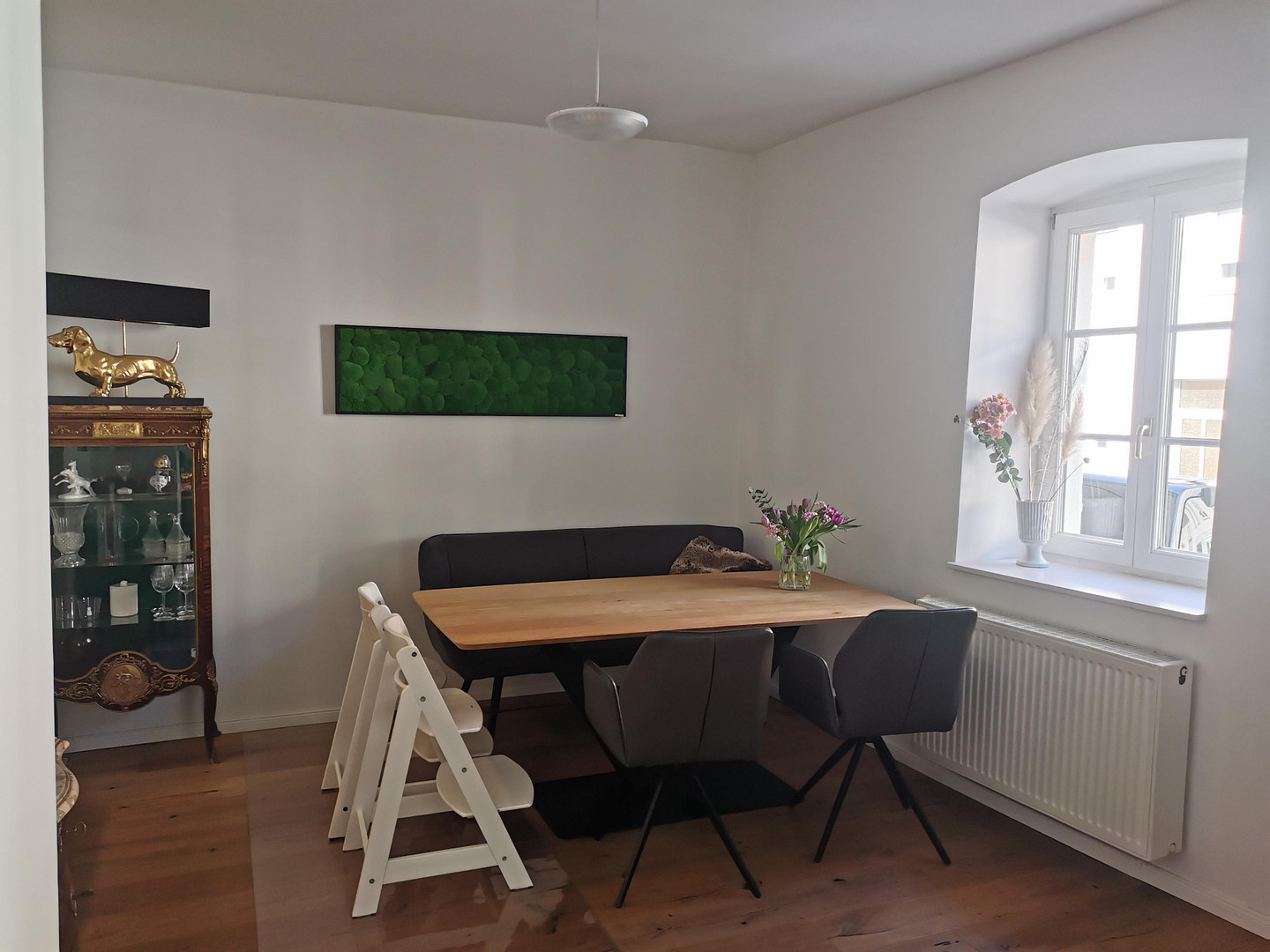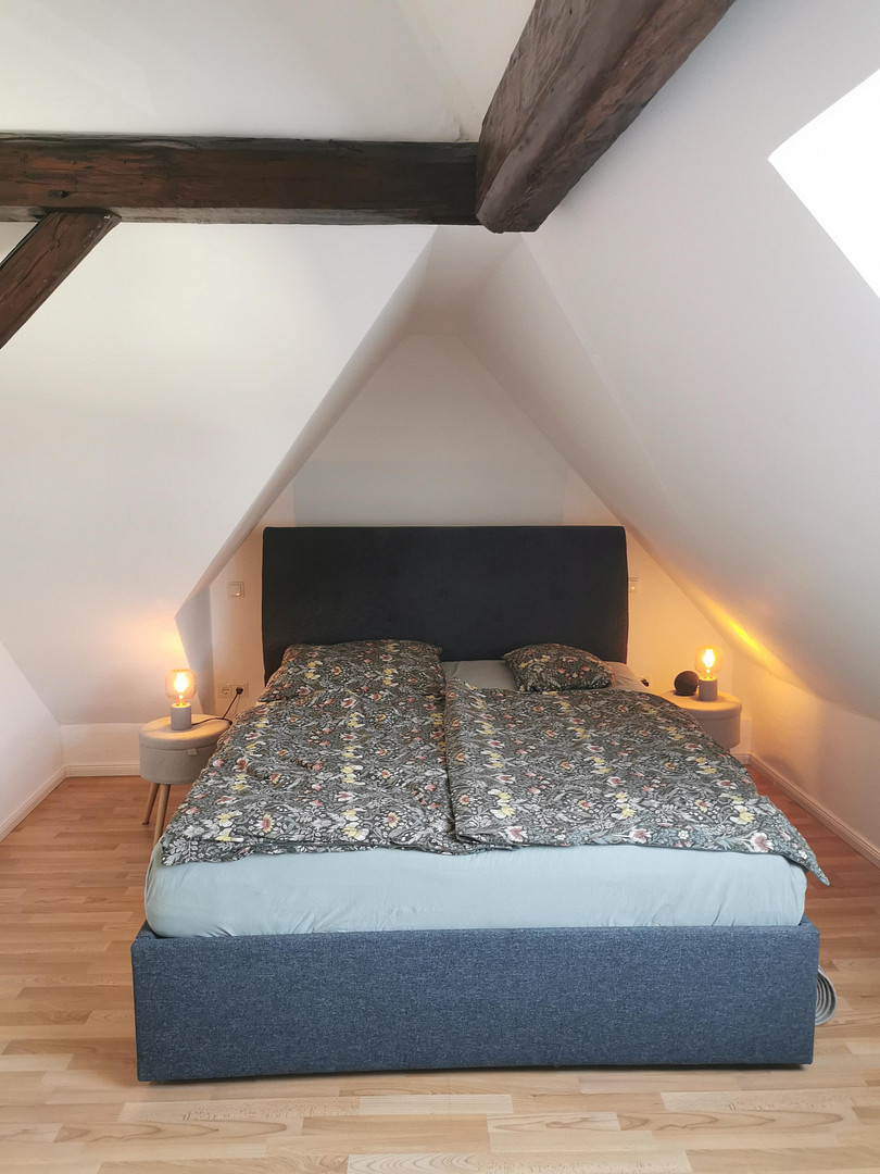 This semi-detached house, with its view of the barn and courtyard, offers a variety of living and working spaces. Everything has been thoughtfully designed and expertly renovated in 2005. A large courtyard gate leads to a beautiful inner courtyard. You enter the house via three steps. The courtyard is part of the shared ownership and is available for communal use. The entire property is divided according to the "Wohnungseigentumsgesetz" (WEG) law.
