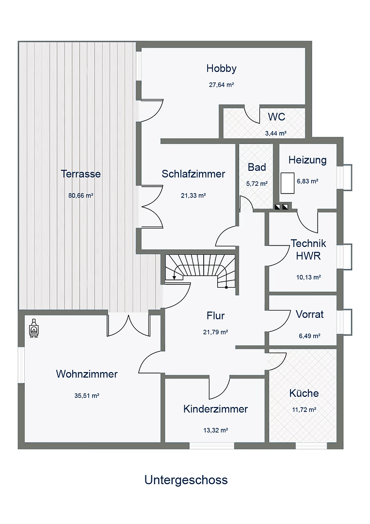 Lower ground floor apartment with a large terrace and garden access, a spacious living room with a fireplace, a kitchen-living area (including fitted kitchen), 1 children's room, 1 bedroom, 1 hobby room, 2 bathrooms, and a utility room.