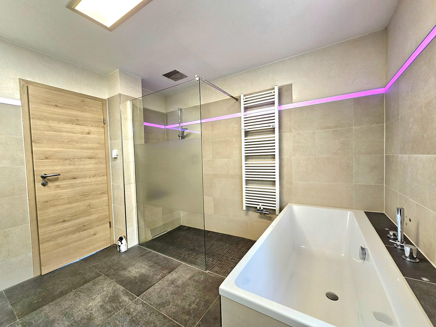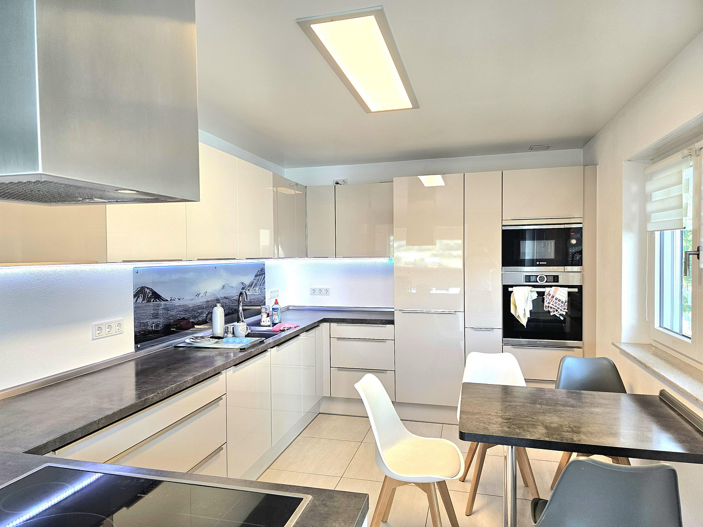 Both apartments feature underfloor heating, modern bathrooms, and an elegant layout. The living areas can be used as a single large unit or as two separate units via a lockable staircase. Both living areas have separate external entrances. 9.99 kWp photovoltaic system with Tesla battery storage and backup power, gas heating, ample storage space (large garage + huge attic - approximately 190 m² total) & 4 parking spaces with 2 wallboxes.