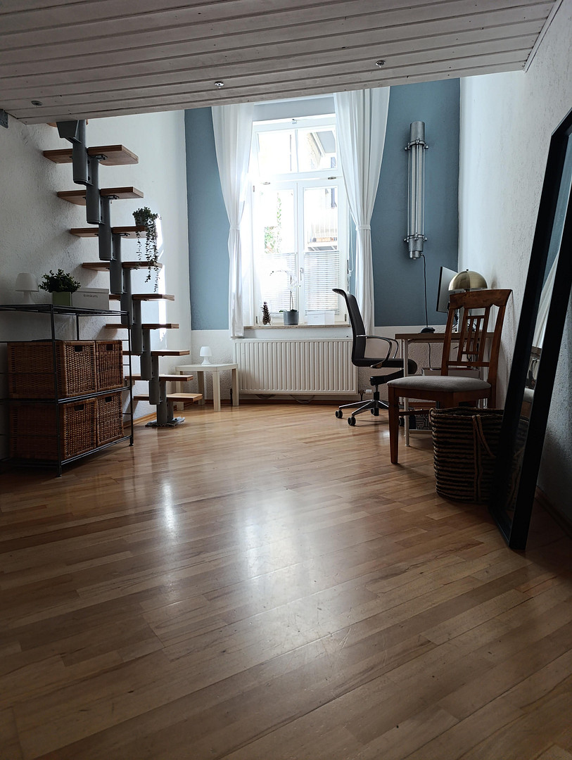 This charming 2.5-room apartment is located in a quiet yet central area in the former brewery district. It features generous ceiling heights and is very bright due to windows facing south, west, and east. The public transportation connections are excellent: all public transport options, as well as numerous shops, restaurants, and beer gardens, are within walking distance. Bavaria Park and West Park, as well as the Theresienwiese, are also just a few minutes away on foot. The 2.5 rooms are divided into a bedroom, a kitchen-dining room-living room (which can be separated by high-quality sliding glass doors), a hallway, and a bathroom (with two windows) featuring a shower, sink, toilet, and urinal, as well as a washing machine connection. The living and dining areas, as well as the kitchen, have ceilings with plaster cornices. The bedroom has a wooden ceiling (which can be used as a double bed). The wooden windows and terrace door are white, double-glazed, and lockable; they were installed in 2004 and are in very good condition. The apartment includes a 10 square meter cellar room (brick-built, with a window to the courtyard). In the cellar, there is also a laundry room (with a brand new Miele industrial washing machine) and a drying room.
