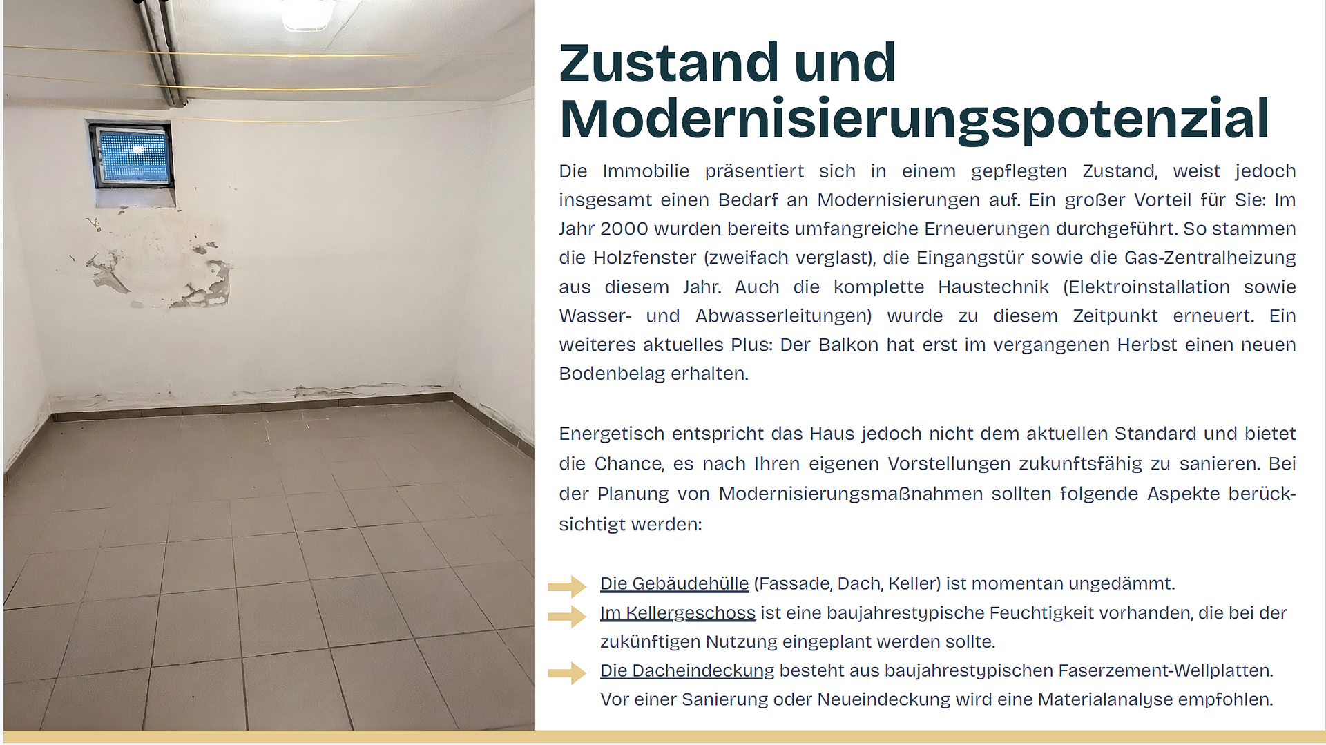 However, from an energy efficiency perspective, the house does not meet current standards and offers the opportunity to renovate it to be more energy-efficient, according to your own preferences. When planning modernization measures, the following aspects should be considered: