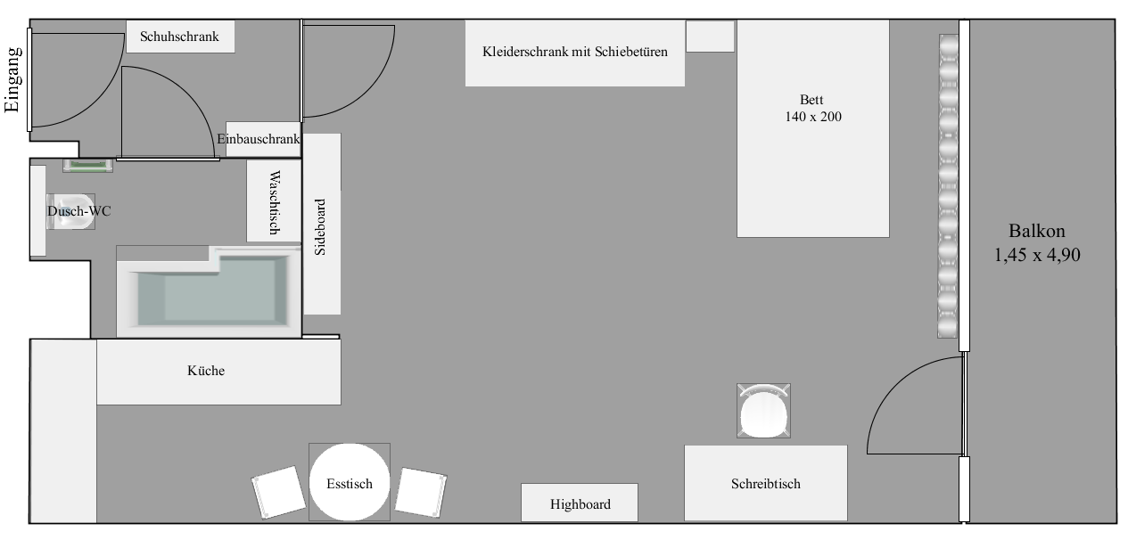 Large window front with triple glazing and access to the balcony, concealed curtain tracks, wall mount for television, bed 140 x 200, wardrobe with ample storage space, sideboard, highboard with concrete-look finish, large desk, desk chair, designer floor lamp, laminate flooring.