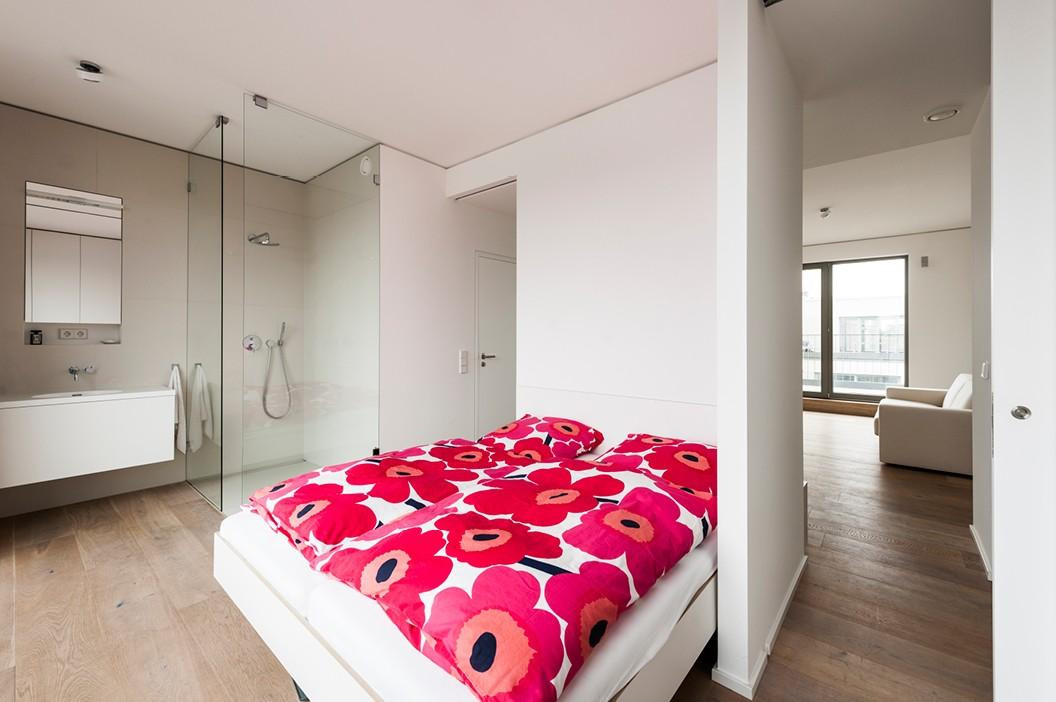 The apartment's features are currently in line with modern, high standards. It includes white-oiled wooden flooring with underfloor heating, large-format tiles, a walk-in shower with a glass enclosure, controlled ventilation with central heat recovery, and a greywater system to recycle water for toilet flushing. In addition, the apartment is equipped with a high-quality built-in kitchen with a Corian countertop and upper cabinets. It also features LAN cabling and audio cabling for a Dolby Surround sound system.